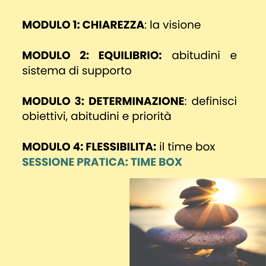 Non mi sento più bloccata nell’organizzare il mio tempo. Riesco a incasellare gli impegni seguendo i miei valori e la visione di vita a cui aspiro.