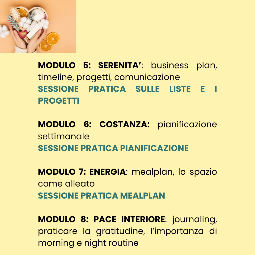 Mi sento finalmente dotata di un metodo chiaro e concreto. Ho una scaletta che mi aiuta a pianificare la settimana, a fare chiarezza sui miei bisogni e a riconoscere le mie priorità.